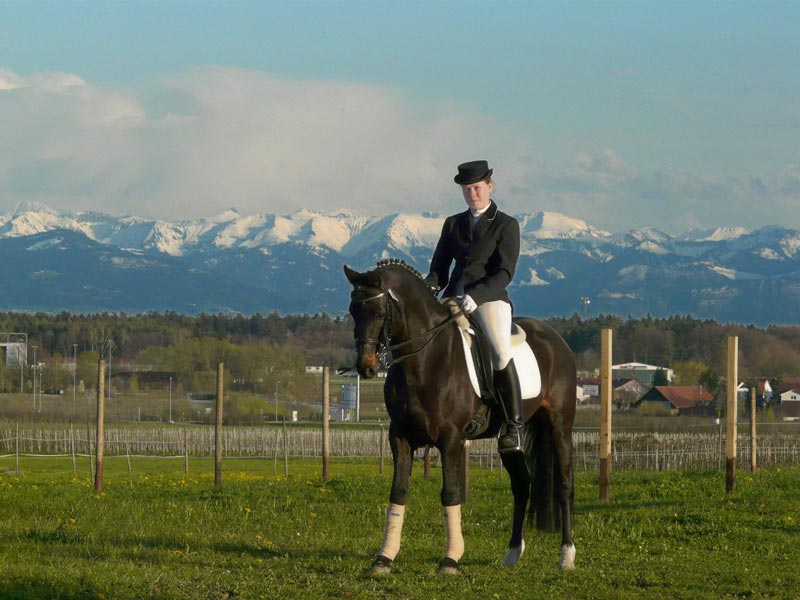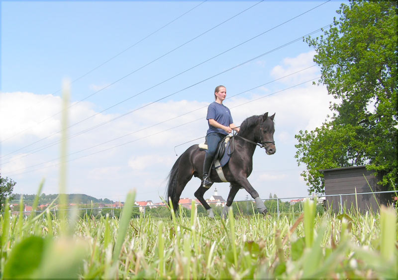 Reitponyhengst Bazooka, einen hinsichtlich Exterieur, Umgänglichkeit, Typausprägung, Leistungsbereitschaft und Blutführung ausgezeichneten Reitponyhengst. Bazooka ist süddeutsch gekört und zugelassen für die süddeutschen Verbände. Bazooka ist ausgebildet bis Dressur Kl. M, hat zahlreiche Siege und Platzierungen in Dressuren bis zur Klasse M.